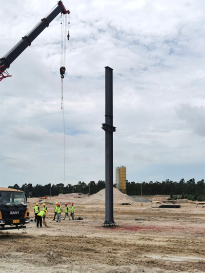 2020年8月16日11:16,經(jīng)過(guò)為期兩個(gè)月的基礎(chǔ)開(kāi)挖,基坑換填,承臺(tái)施工,墩柱施工,鋼構(gòu)預(yù)埋,廣西新福興硅科技產(chǎn)業(yè)園聯(lián)合車間第一根鋼柱立起來(lái)了!